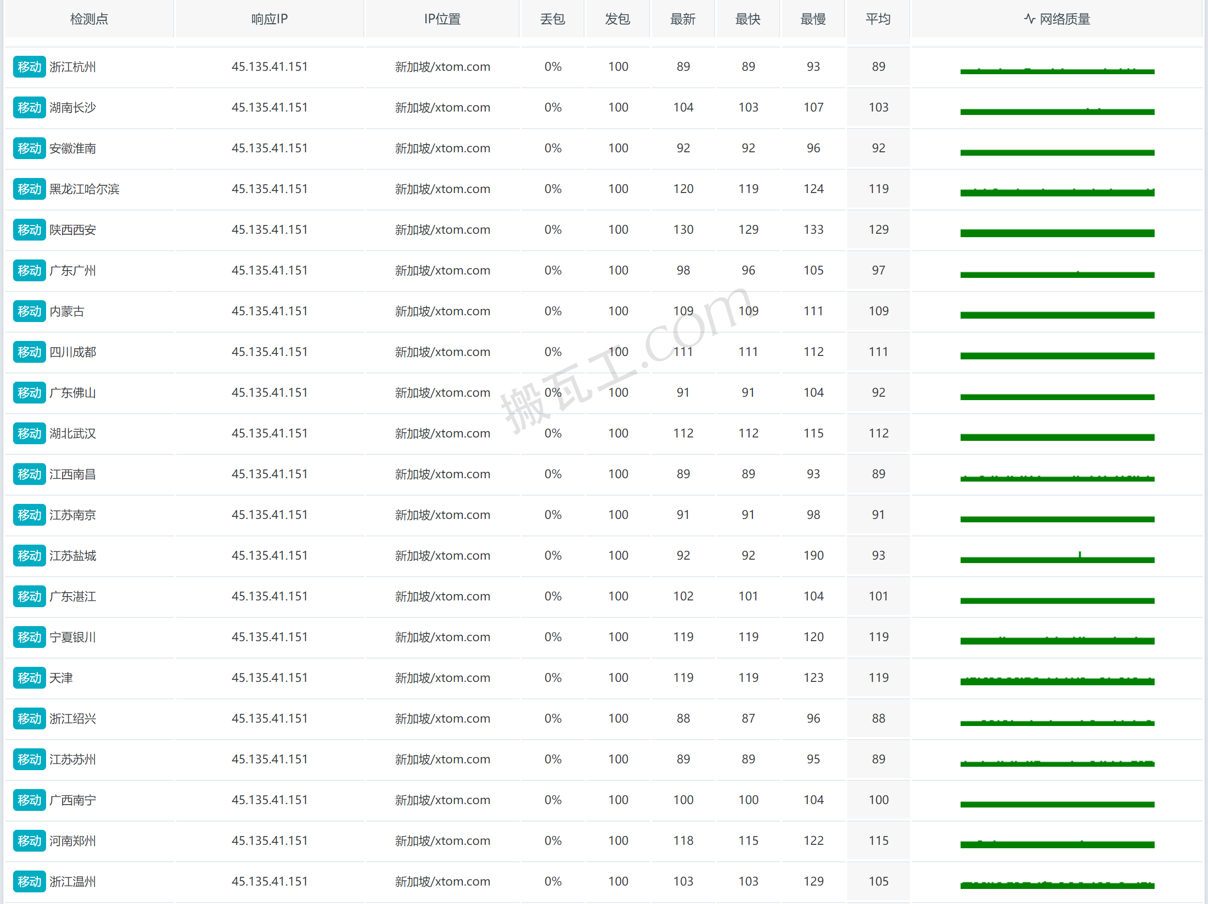 搬瓦工新加坡CN2 GIA套餐(SG - Singapore CN2GIA (SG_1))直连中国大陆延迟表现测试结果:
