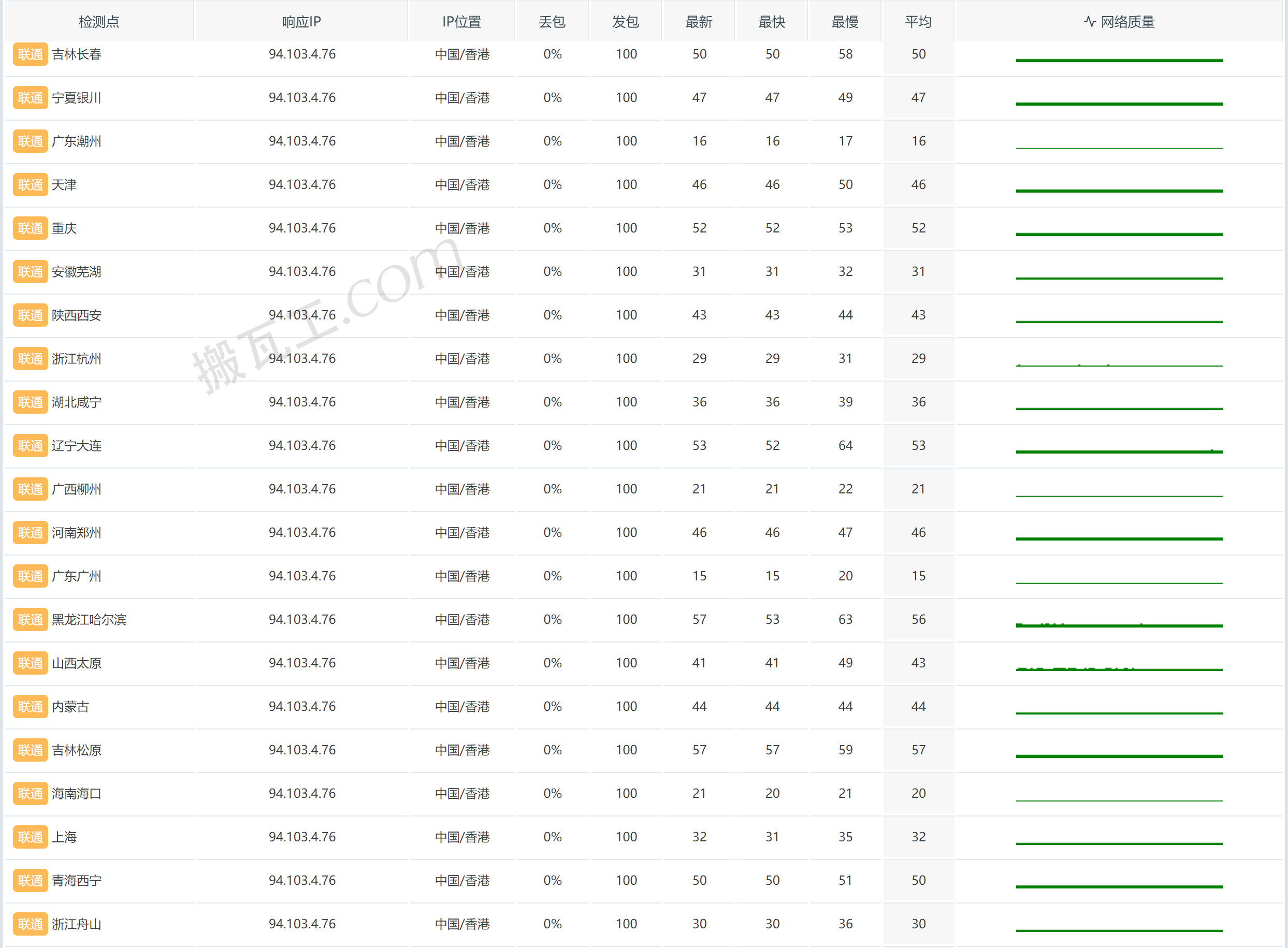搬瓦工香港CN2 GIA套餐(HK - Hong Kong CN2 GIA (HKHK_8))中国联通丢包响应表现测试结果: