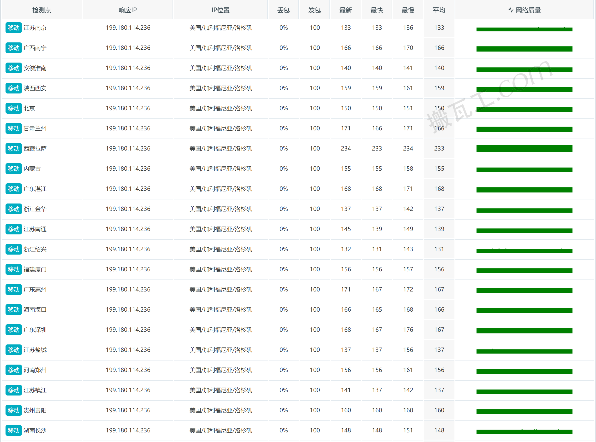 搬瓦工美国洛杉矶DC6 CN2 GIA套餐(US - Los Angeles DC6 CN2GIA (USCA_6))中国移动丢包表现测试结果: