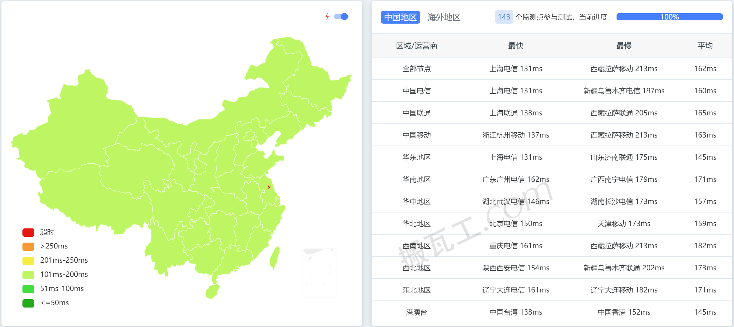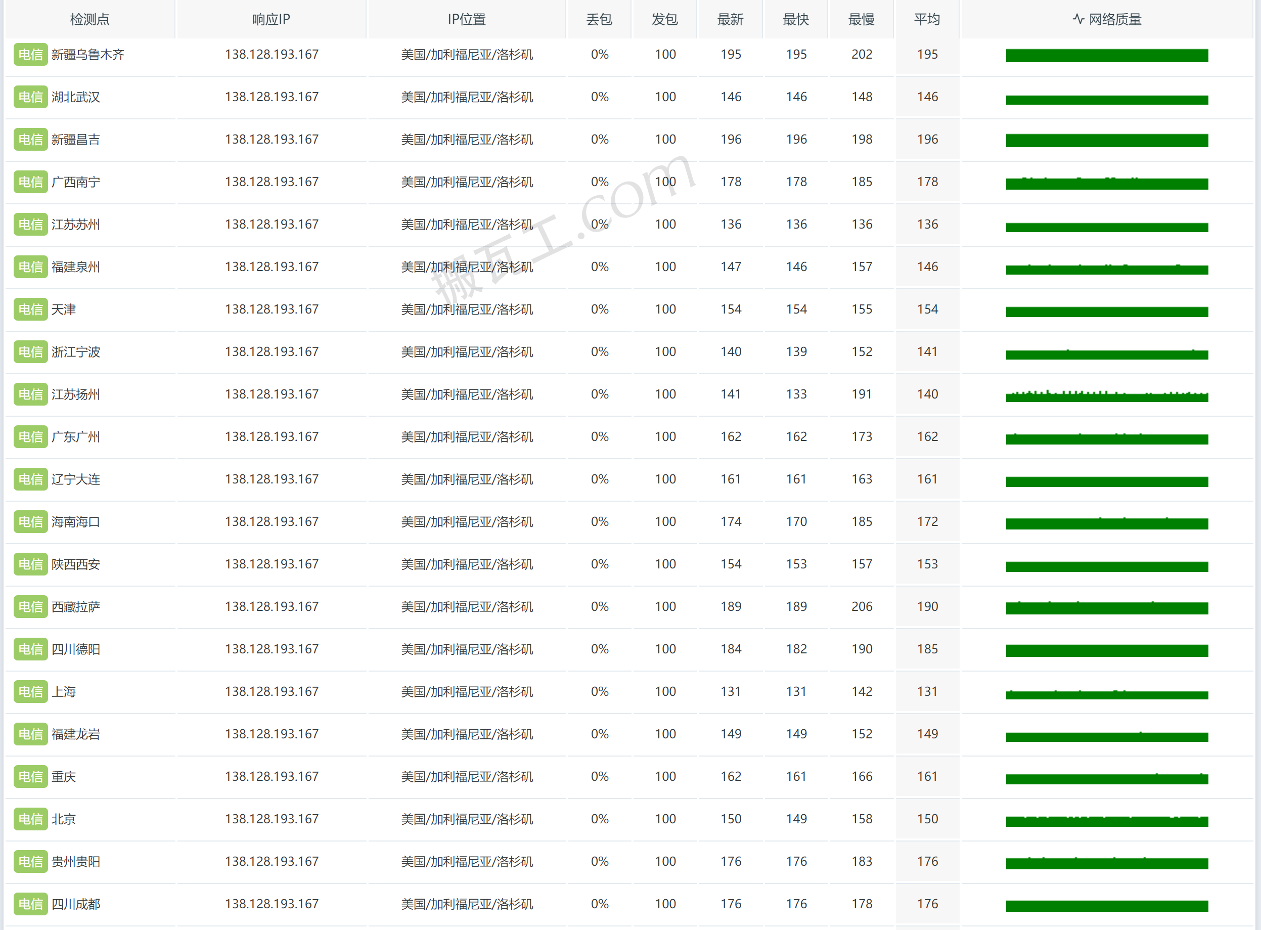 搬瓦工美国圣何塞机房CN2 GIA套餐(US - San Jose (USCA_SJC5))直连中国大陆延迟表现测试结果: