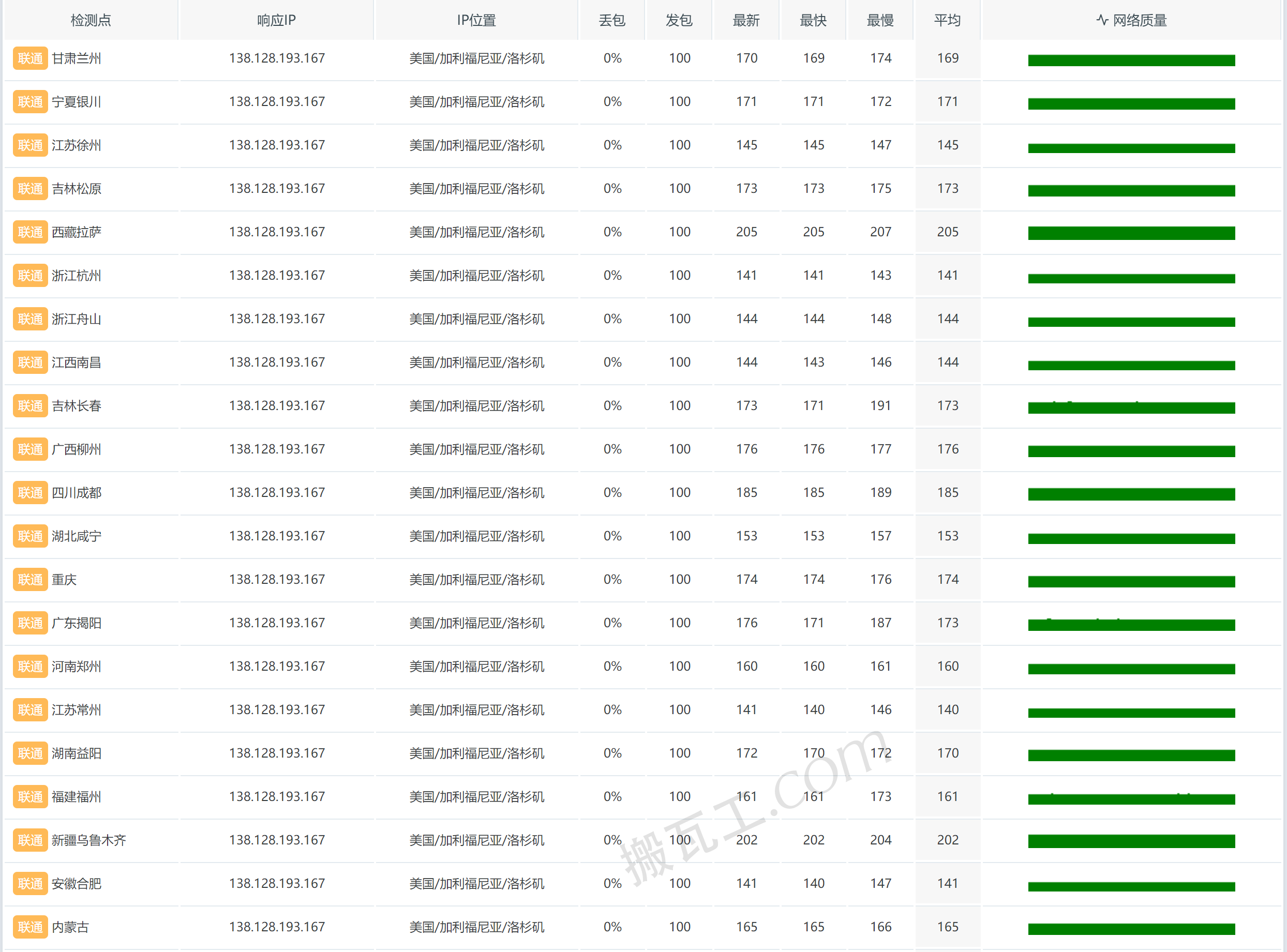 搬瓦工美国圣何塞机房CN2 GIA套餐(US - San Jose (USCA_SJC5))中国联通丢包表现测试结果: