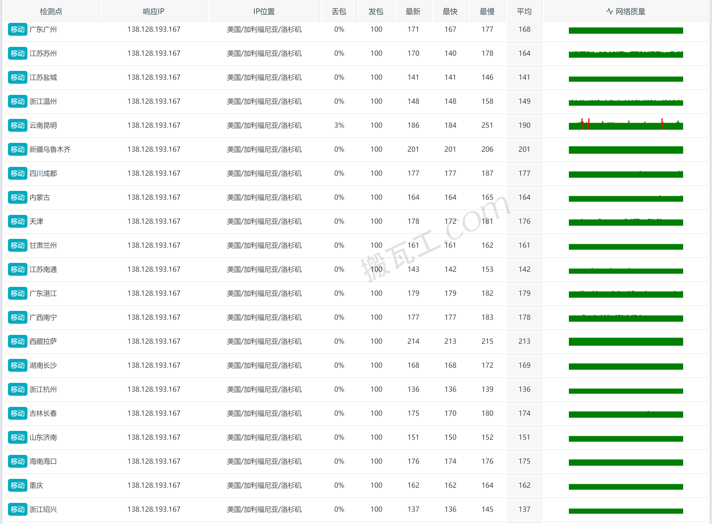 搬瓦工美国圣何塞机房CN2 GIA套餐(US - San Jose (USCA_SJC5))中国移动丢包表现测试结果: