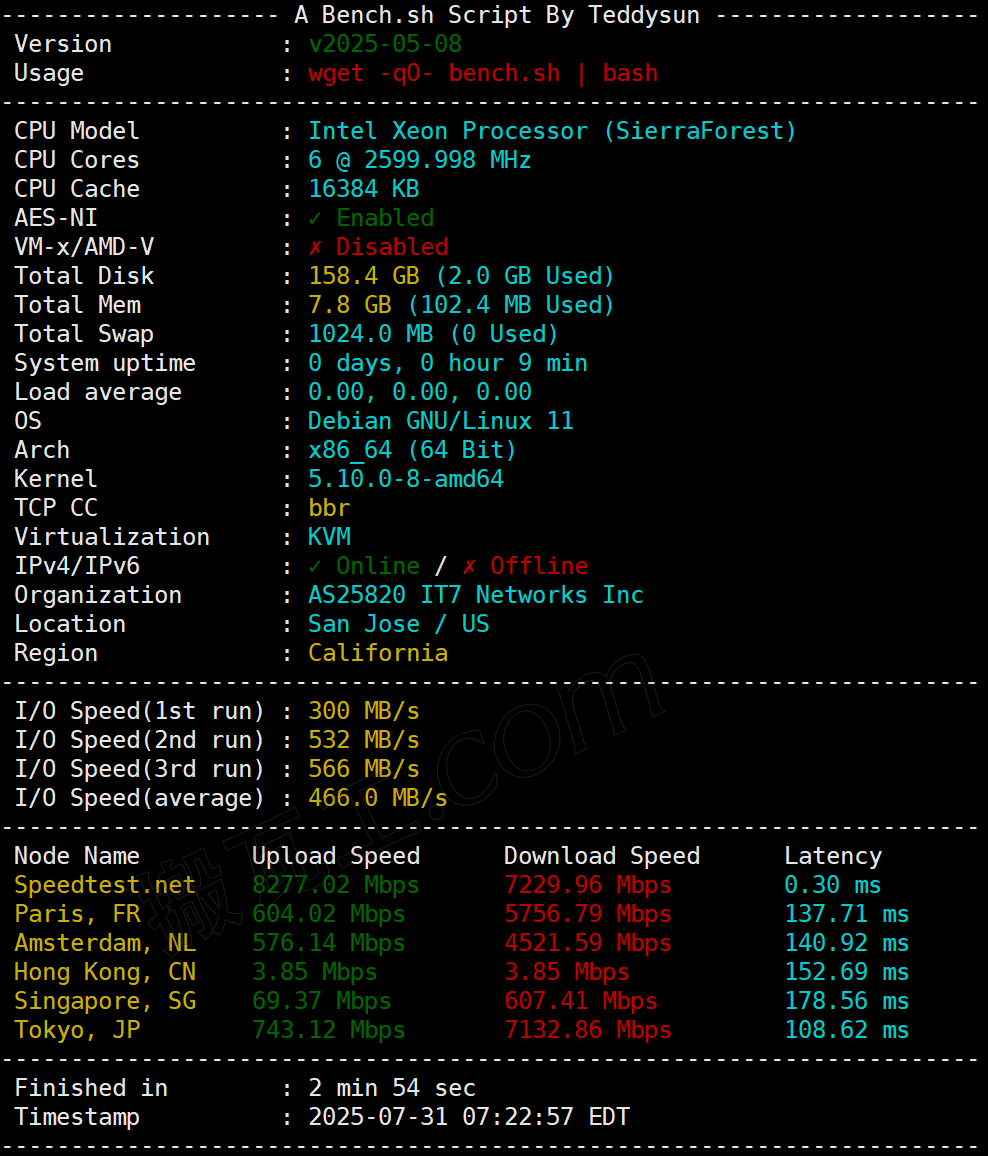 今天给大家带来的是搬瓦工美国圣何塞机房(US: San Jose, California (CT CN2GIA-E, CMIN2, CUP) [USCA_SJC5])的评测,搬瓦工圣何塞机房和洛杉矶机房一样属于美西机房,同属于美国西部地区,距离中国大陆地理距离上近一些,所以也是很多做优化路线的IDC商家集中的大型机房。本文我们将从速度延迟丢包率VPS性能等方面测试搬瓦工圣何塞机房的套餐数据,从测得面板数据角度分析与其他美西机房有何不同,是否值得购买。