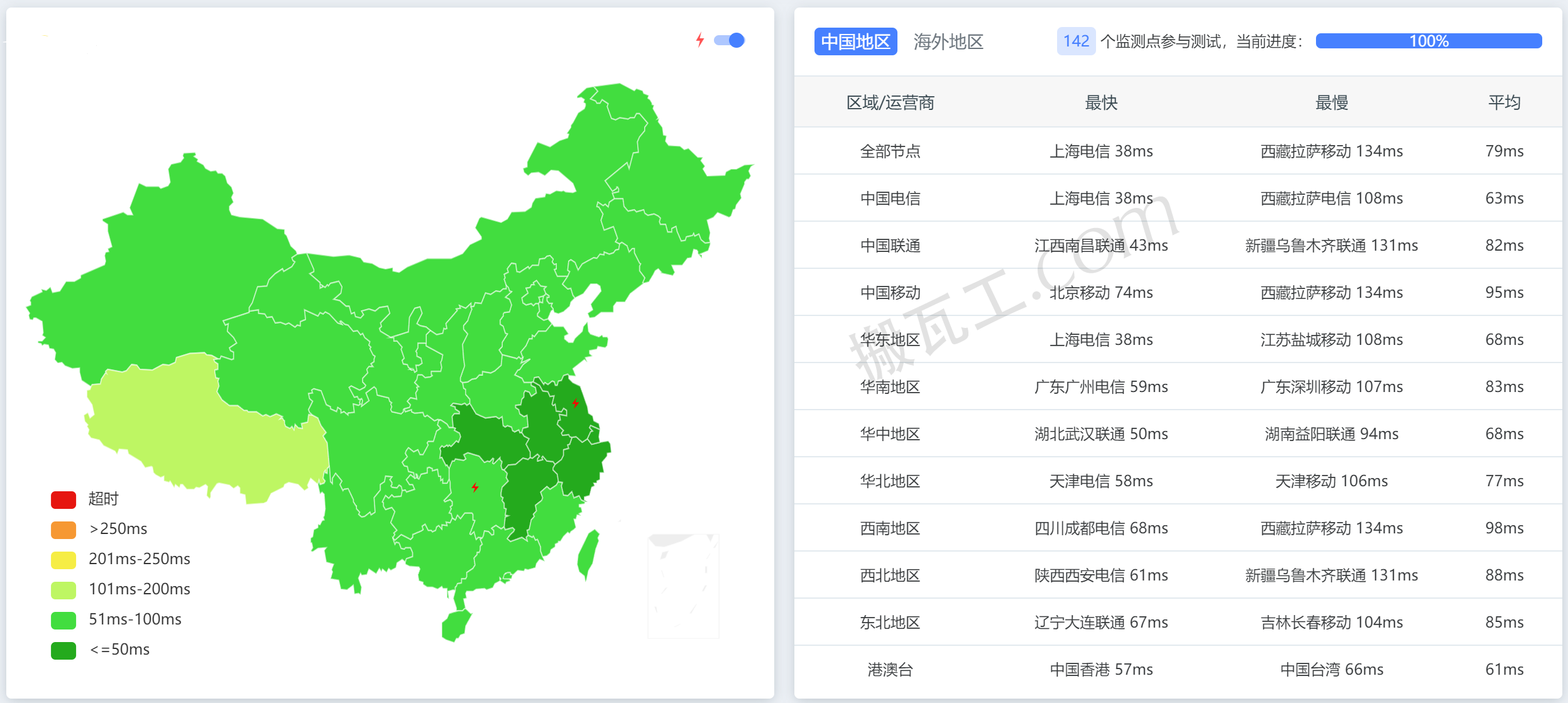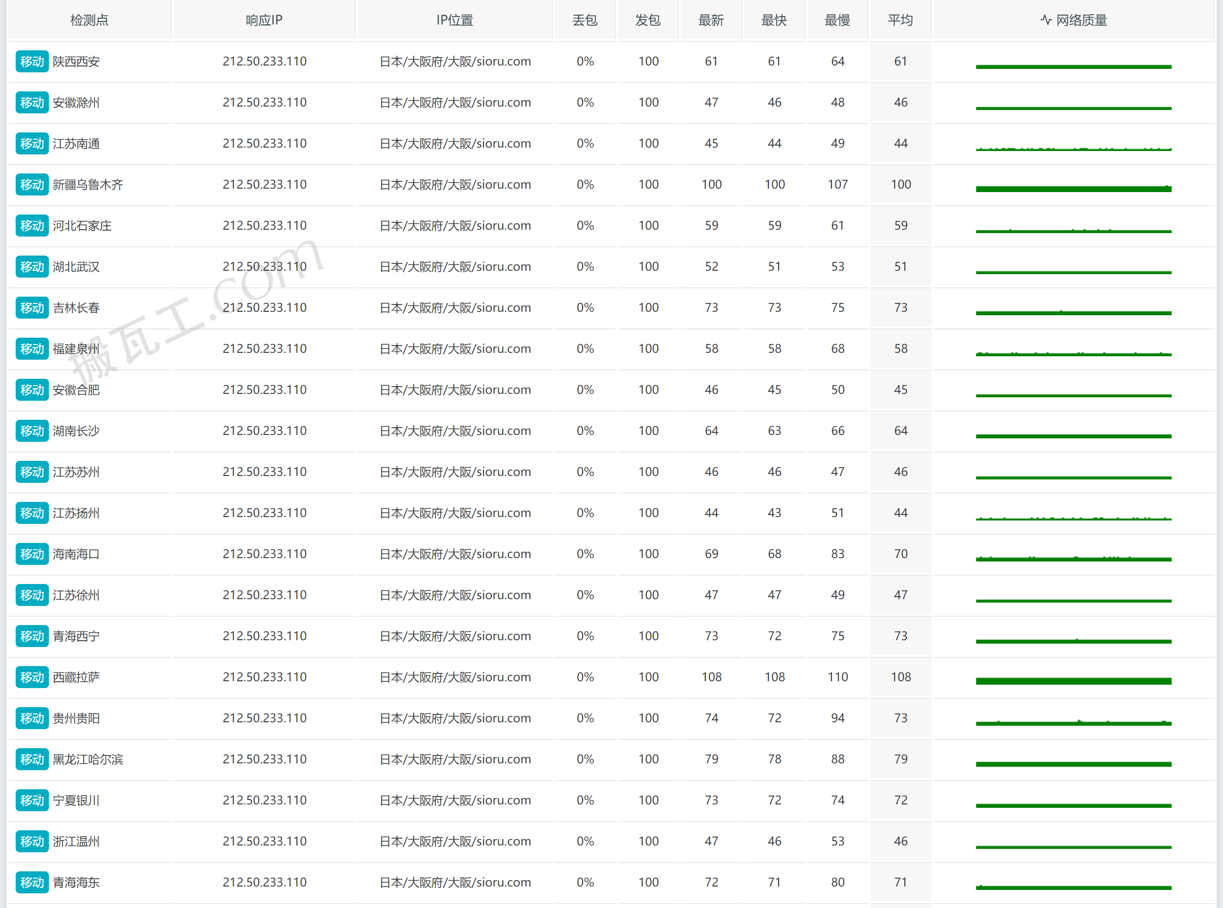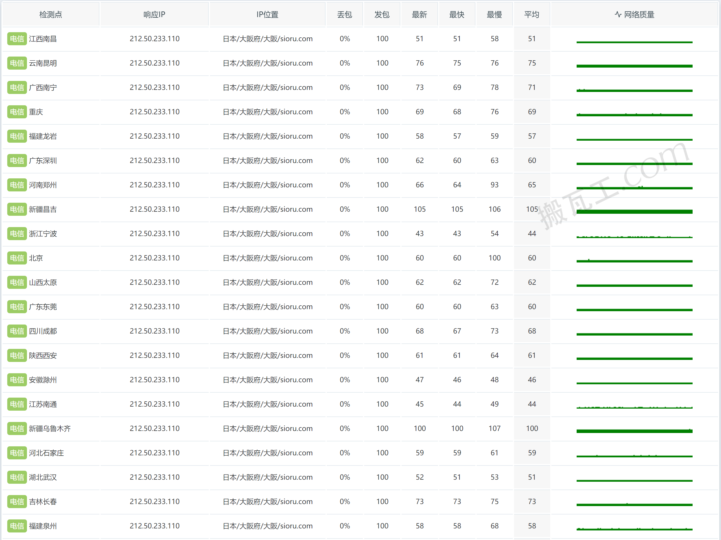 搬瓦工日本大阪CN2 GIA套餐(JP - Osaka Equinix CN2GIA (JPOS_6))直连中国大陆延迟表现测试结果: