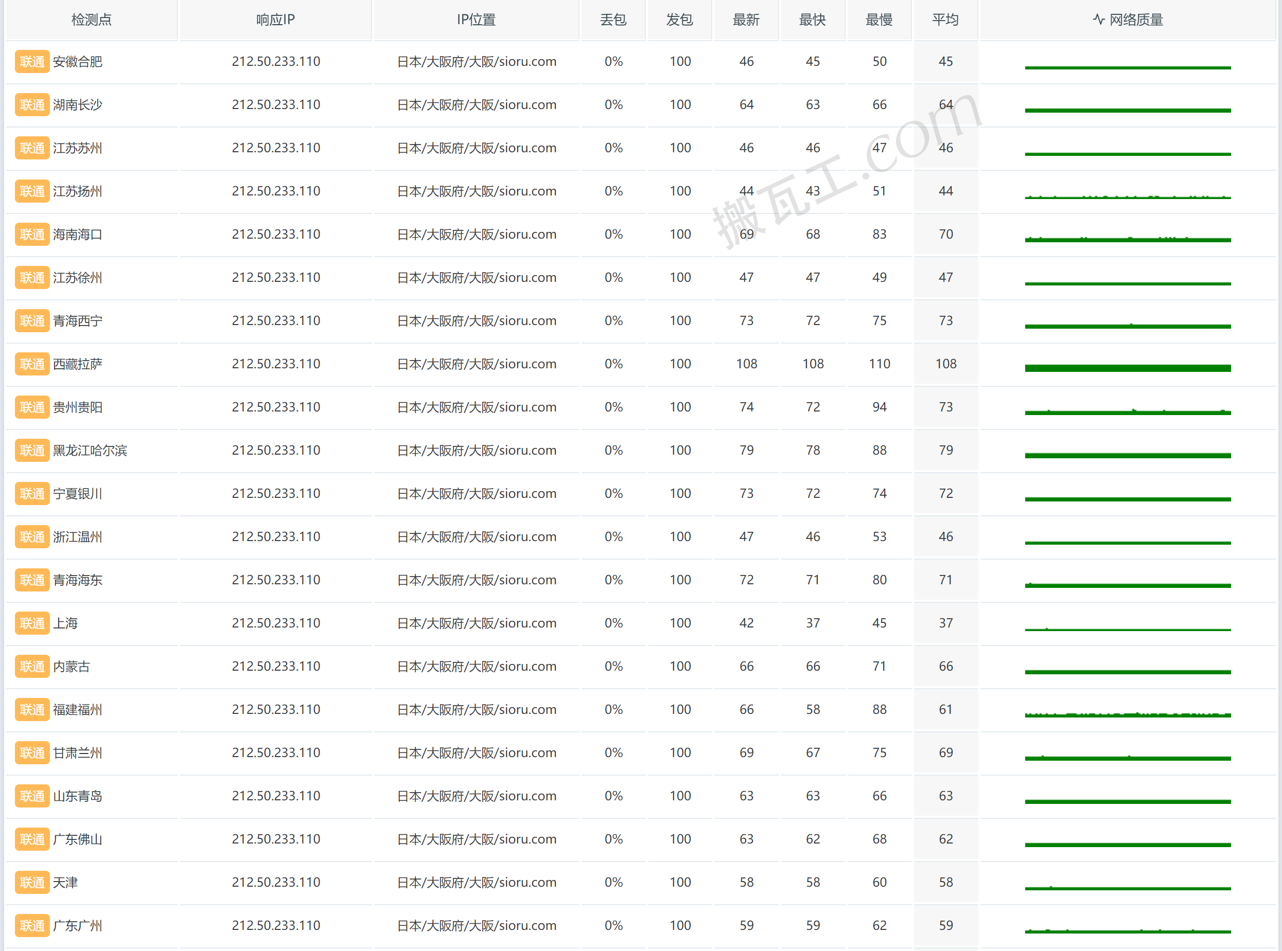 搬瓦工日本大阪CN2 GIA套餐(JP - Osaka Equinix CN2GIA (JPOS_6))联通丢包响应表现测试结果: