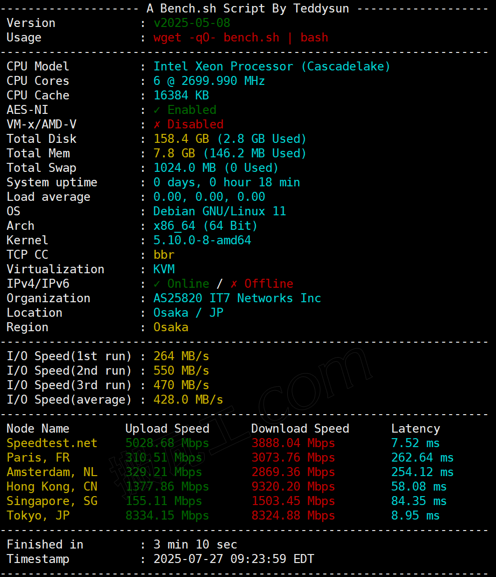 搬瓦工日本大阪CN2 GIA套餐(JP - Osaka Equinix CN2GIA (JPOS_6))性能表现测试结果: