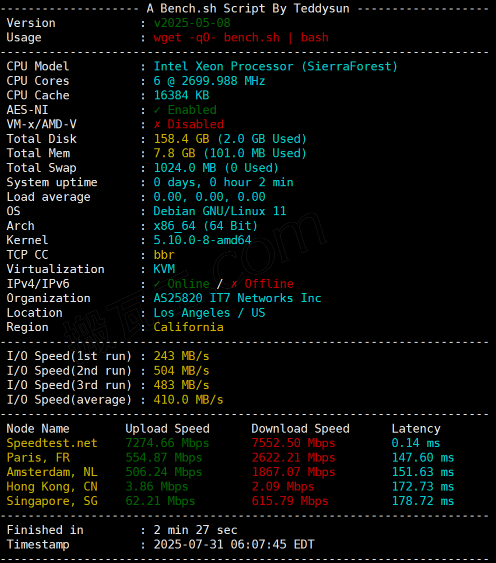 搬瓦工美国洛杉矶DC6 CN2 GIA套餐(US - Los Angeles DC6 CN2GIA (USCA_6))性能表现测试结果: